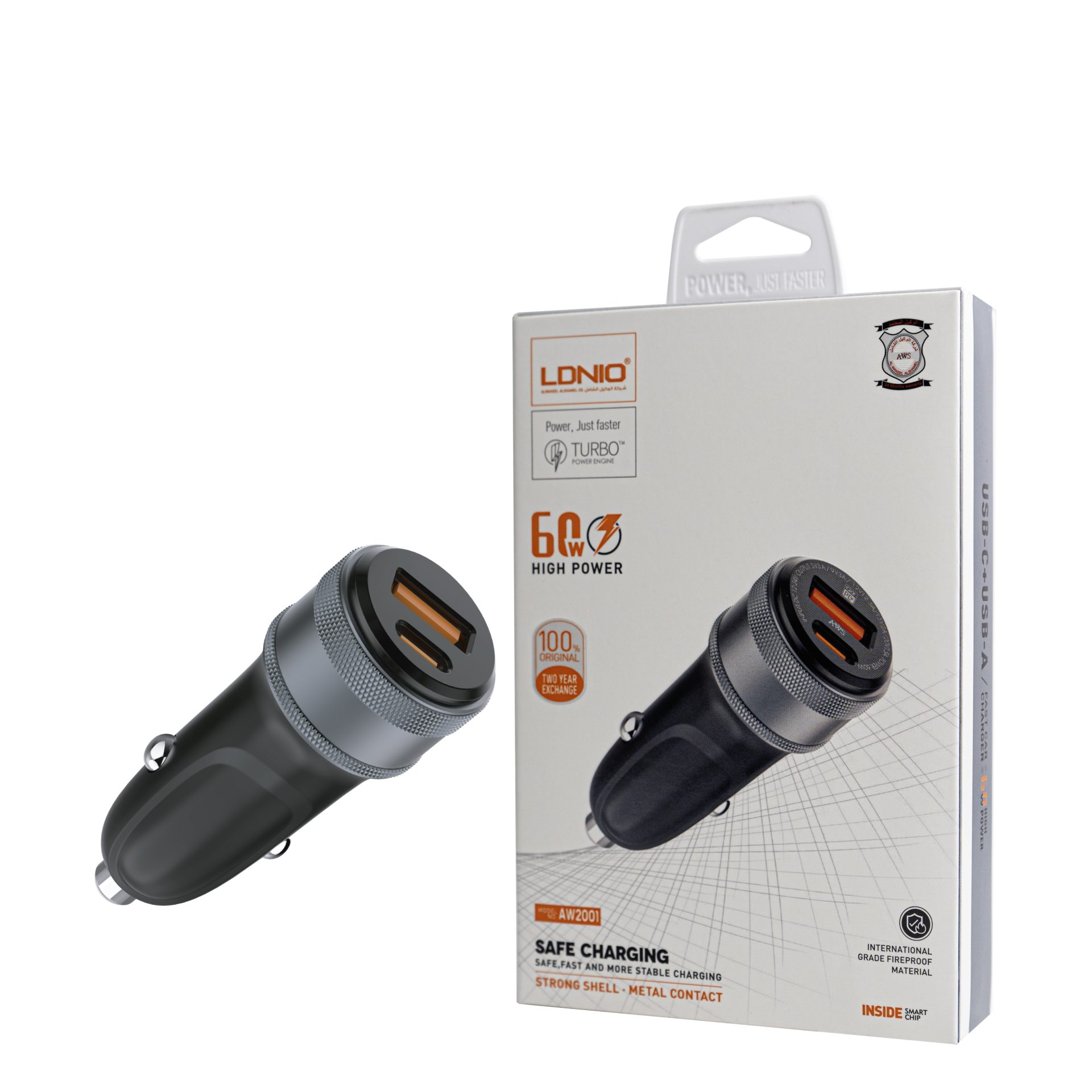 شاحن سيارة LDNIO بقوة 60 واط – منفذ USB-C و USB-A يدعم الشحن السريع AW2001
