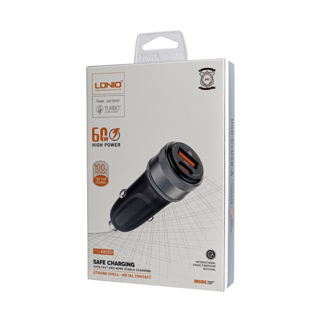 شاحن سيارة LDNIO بقوة 60 واط – منفذ USB-C و USB-A يدعم الشحن السريع AW2001