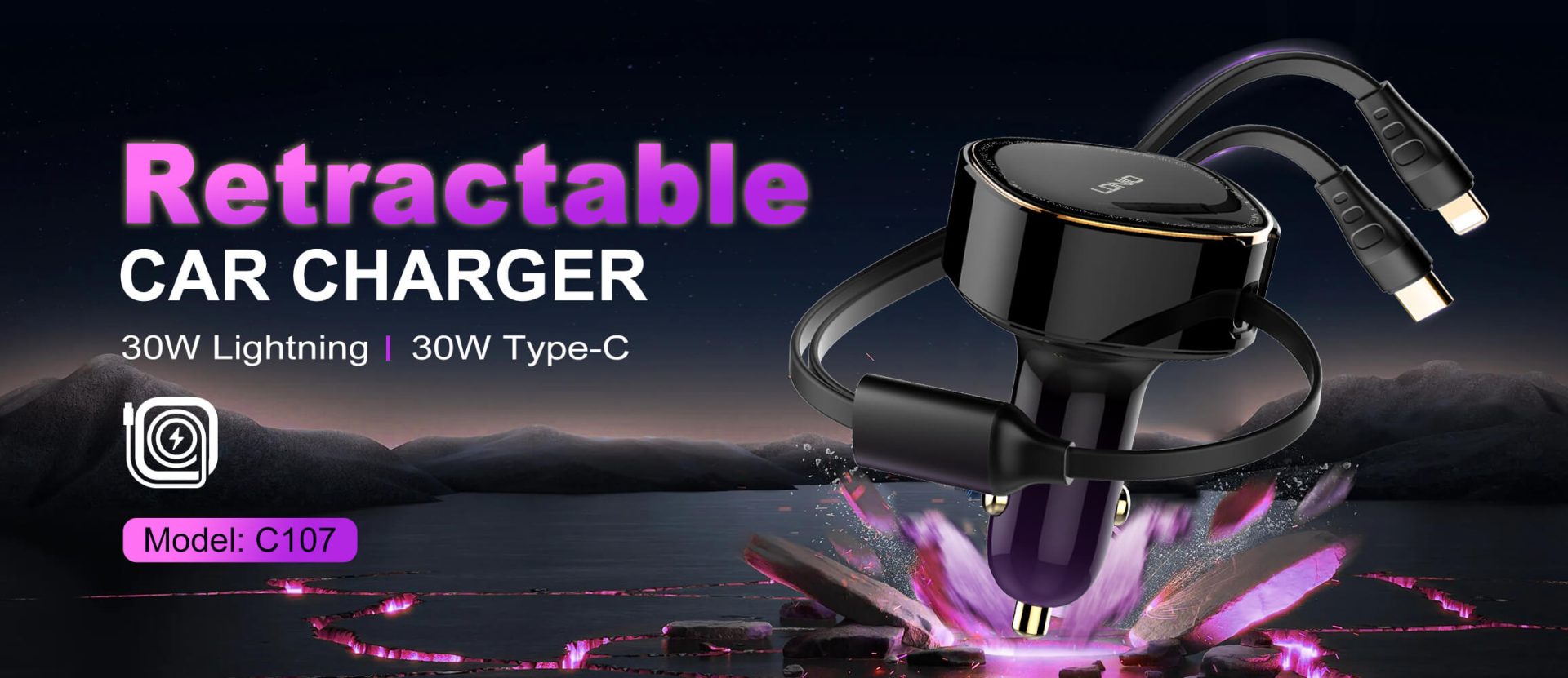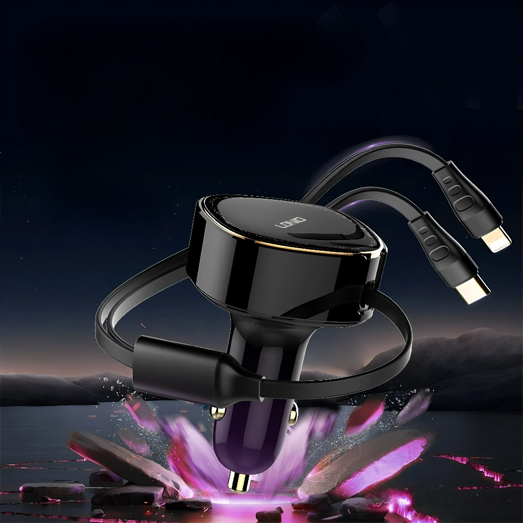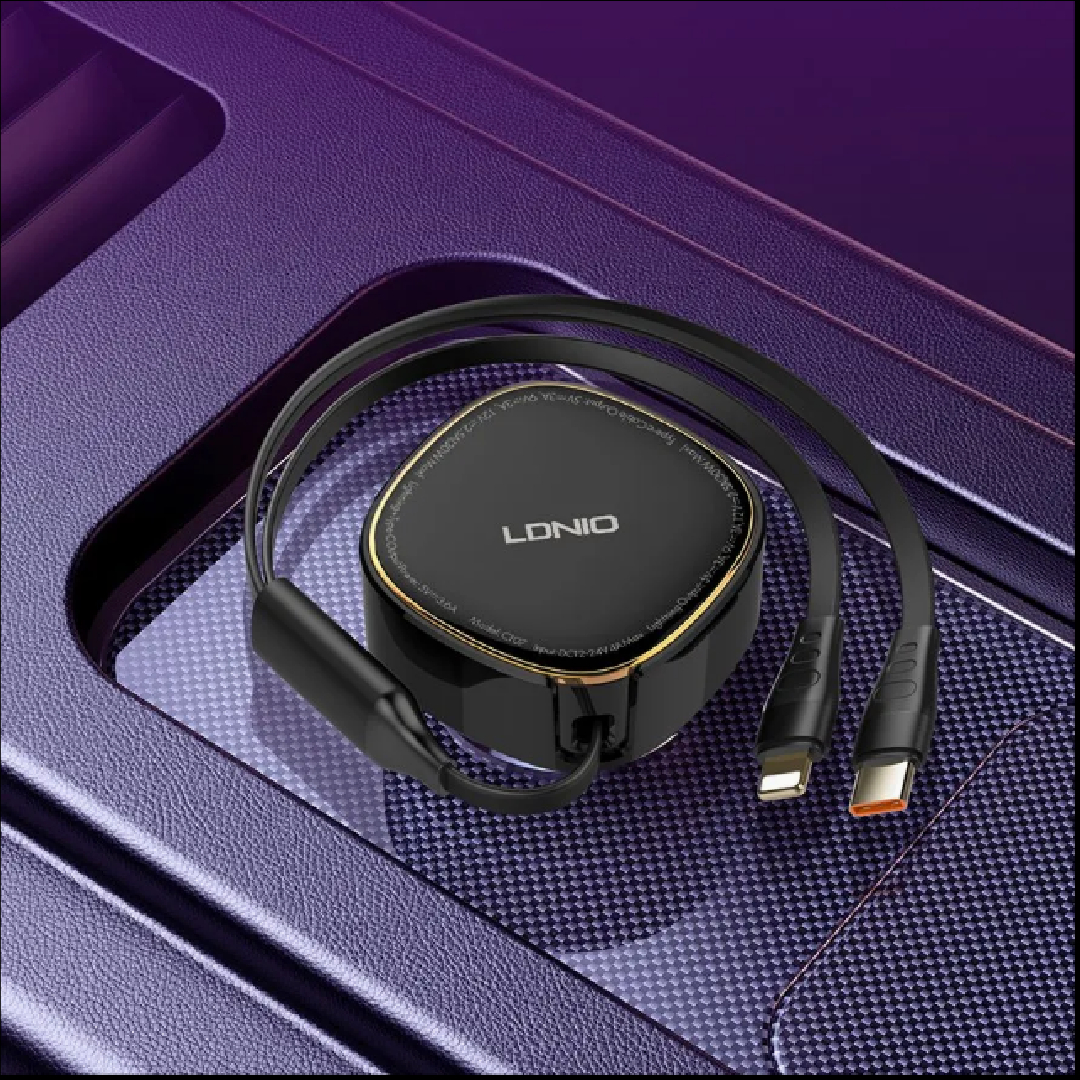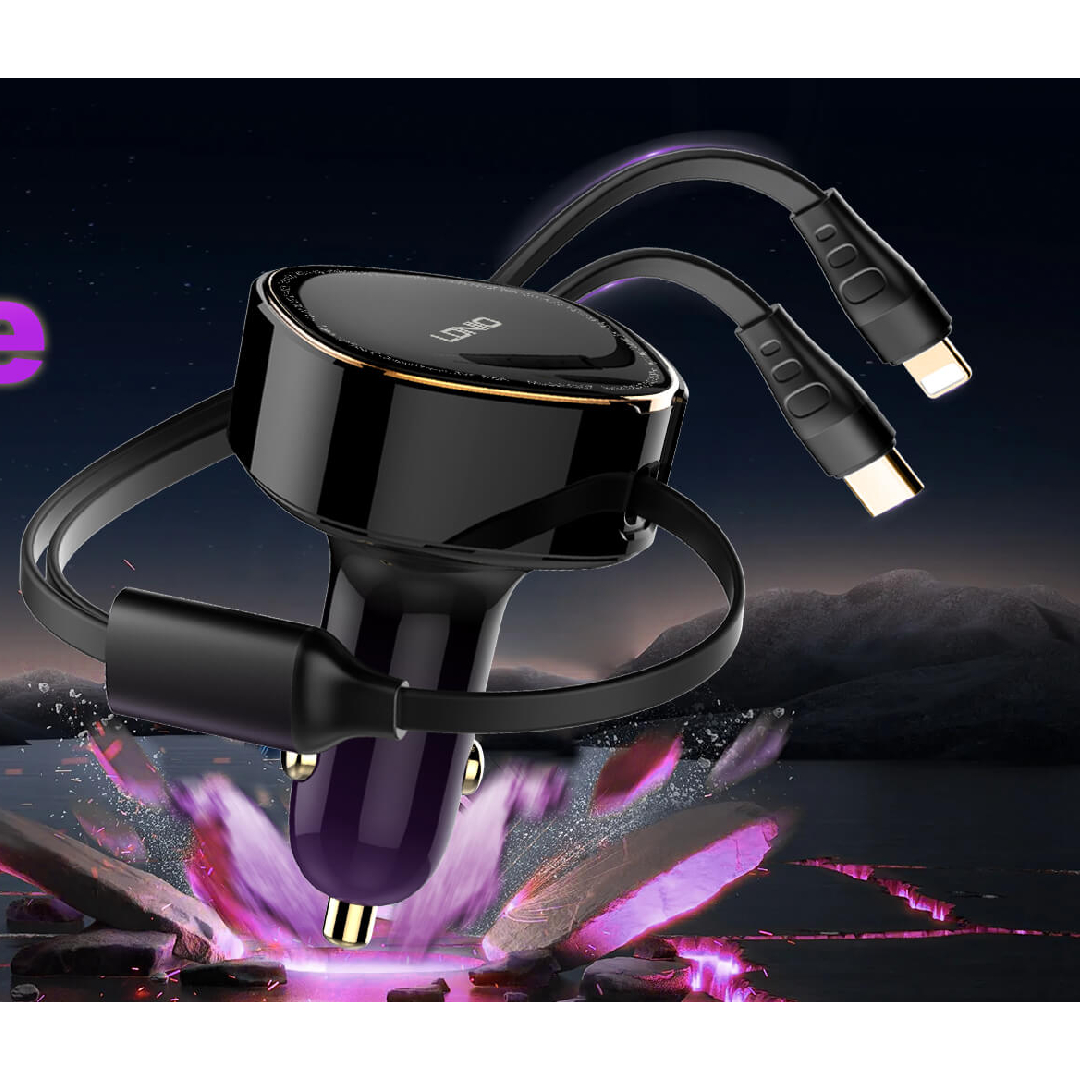 شاحن سيارة LDNIO C107 مع كابلات مدمجة (Lightning & Type-C)